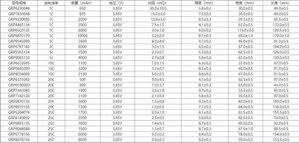格瑞普目前拥有低温电池、高倍率电池、模块化电池、高压电池、大容量电池、快充电池、电池组、异形电池等系列电池。产品涉及到了行业众多,电池产品受到了行业内外的客户和用户的一致认可。