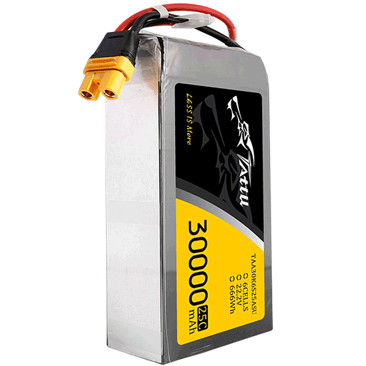 - 容量:30000mAh - 配置:6S1P / 22.2V - 放电率:25C - 最大瞬时放电:50C - 净重(±20g):3228g - 200Wh/kg的能量密度 - 至少300+次循环寿命 - 平衡器连接器类型:AS150U-F - 尺寸:218mmx120.5mmx60.5mm(L*W*H)