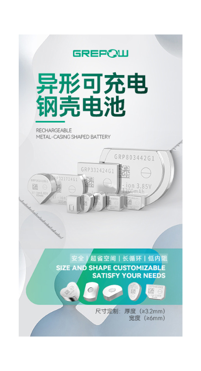格瑞普不仅提供可定制的金属外壳形状电池,也提供量身定制的解决方案。钢壳异形电池设计薄至 3.5 mm,窄至 6 mm,可满足任何特定形状的要求。这些电池还可定制为指定电压(3.7V、3.8V、3.85V 和 3.9V),以满足设备的各种需求。